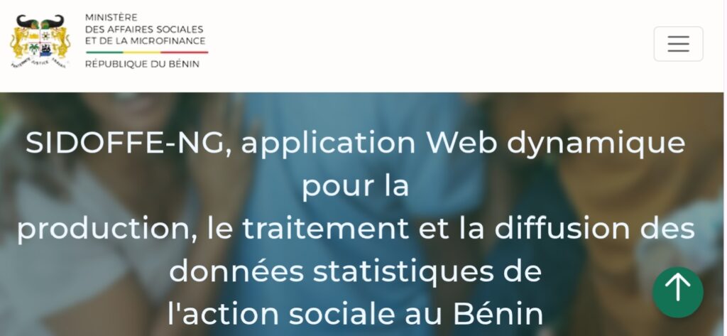 Accessible via www.sidoffe-ng.social.gouv.bj et hébergée dans le data center gouvernemental depuis sa mise en place en 2019, cette plateforme garantit une sécurité maximale des données. Elle est administrée par l’OFFE, qui en assure la gouvernance technique et institutionnelle. Son alimentation est assurée par les acteurs locaux (GUPS, police, services de santé, ONG) et permet la production mensuelle de 404 indicateurs statistiques désagrégés par sexe, âge et type de handicap. Ces données couvrent quatre grands domaines de l’action sociale ( protection sociale et solidarité nationale; protection de l’Enfant; promotion de la famille, de la femme et du genre; inclusion sociale des personnes handicapées et du troisième âge).